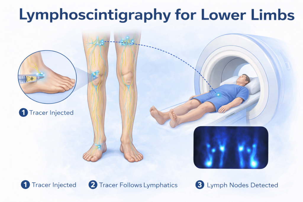 Lymphoscintigraphy is a nuclear medicine scan used to assess the lymphatic system, which helps drain fluid and fight infection. This scan helps detect blockages in lymphatic drainage, evaluate lymphoedema (limb swelling), or locate the sentinel lymph node (first lymph node to which cancer may spread).